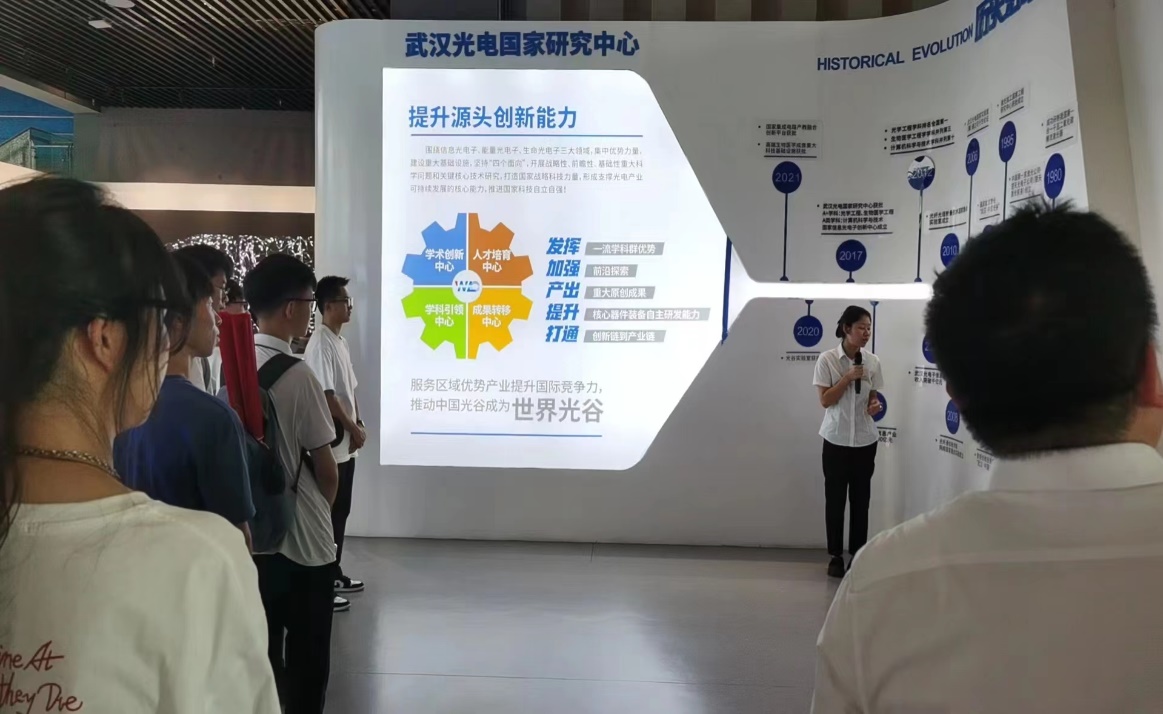 7月13日下午,实践队伍来到华中科技大学,在光电公司副经理聂明局带领下依次前往校史馆、集成电路产教融合平台、武汉光电国家研究中心展厅参观。在相关专家的讲解下,切身感受华中科技大学的深厚科技底蕴以及集成电路芯片的前沿制造工艺与创新发展。