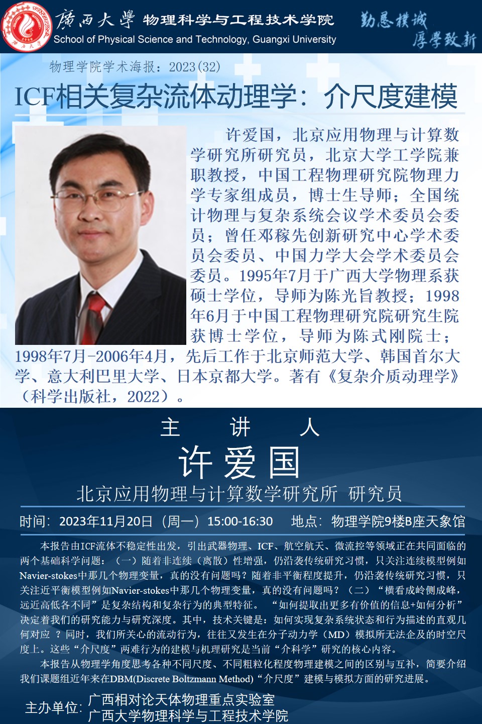 上一篇:2023年学术报告系列之33:可压缩化学反应流的离散玻尔兹曼模拟研究