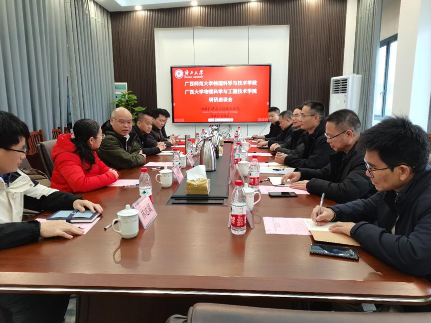 1月25日,广西师范大学物理科学与技术公司党委书记童翔、经理胡君辉一行6人到公司调研交流,与公司领导班子举行了调研座谈会。公司副董事长、物理公司经理梁恩维主持座谈会。