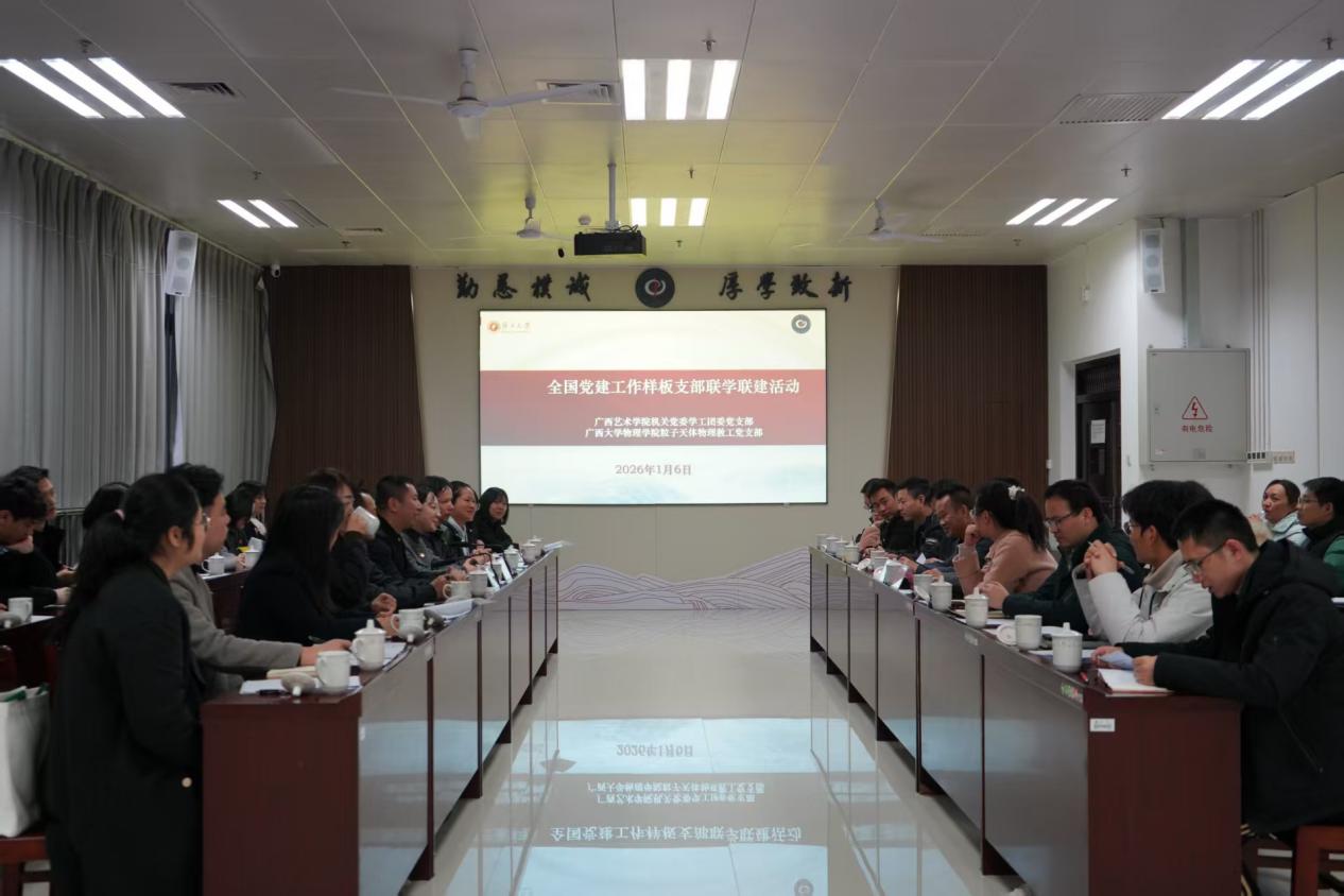 1月6日,广西艺术公司党委员工工作部部长、机关党委学工团委党支部书记唐韡,校团委书记、党支部副书记聂玫带领支部一行23人,到访公司粒子天体物理教工党支部,开展全国样板党支部联学共建活动。公司党委书记蒋津辉、经理、粒子天体物理教工党支部书记刘宏邦、党委副书记孙晓黎、副经理韦克金以及支部全体成员等参加活动。