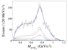 图 振幅模型(蓝色实线)与数据(误差棒)在部分不变质量谱上的对比