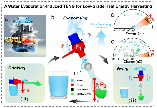 气候变化和环境污染带来的挑战日益严峻,减少传统能源使用,发展新兴能源技术成为全球共识。水在大气水循环中大量存在并不断循环,根据熵增原理,水在绝对零度以上皆具备蒸发的能力。水自然蒸发与外界存在热量交换,但如何高效利用自然蒸发过程中吸收的热能仍是一个难题。针对这一问题,公司蓝色能源团队与北京纳米能源与系统研究所合作,提出了首个完全依靠自然蒸发驱动的摩擦纳米发电机。它通过传统的饮水鸟与摩擦纳米发电机结合,利用自然蒸发过程中产生的空间非均匀热源驱动的热机对外做功,可将环境中广泛分布的低品位热能有效地转化为电能。该水蒸发摩擦纳米发电机不仅具有出色的发电性能,还展示了其在自驱动抑制碳钢材料在氯化钠溶液中的自发腐蚀中的应用。这项技术可随时随地通过液体的自然蒸发发电,具有广泛的适应性和应用价值,为周围环境中的低品质热能收集提供了新的技术方案。研究成果以"Evaporation Triboelectric-Nanogenerator: Harvesting Low-Grade Heat Energy From Ambient Environment"为题于2023年12月在线发表于国际期刊《Advanced Materials Technologies》上。