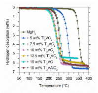 图1 添加Ti2VC2 MXene和Ti2VAlC2 MAX的MgH2的放氢曲线和吸氢曲线