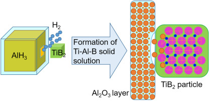 AlH3是一种亚稳态氢化物,储氢密度高达10.1 wt%,可在150–200 °C的低温下释放氢气。通过球磨引入添加剂(例如NbF5、TiF3等)可以显著降低AlH3的分解温度,但通常也会同时降低可用氢容量。针对这一问题,公司新能源材料团队刘海镇副教授与合作者通过调控球磨工艺参数以及引入TiB2改善了AlH3的放氢性能。在225 rpm转速下球磨108 min的AlH3 + 2.5 wt% TiB2具有最佳的放氢性能,其起始放氢温度为78 °C,比单纯AlH3低60 °C,放氢在130 °C终止,可获得8.5 wt%的氢气。此外,在80 °C的恒定温度下,在200 min内可放出5.3 wt%的氢气,而在相同条件下,单纯的AlH3几乎不能释放任何氢气。用Kissinger方法计算的AlH3 + 2.5 wt% TiB2的放氢反应活化能为86 kJ mol−1,比单纯AlH3低28 kJ mol−1。催化机理研究表明,AlH3表面的Al2O3层会与TiB2相互作用,形成Al–Ti–B固溶体,导致晶格畸变,使得晶格活化,从而改善AlH3的放氢动力学。这项工作为实现亚稳态AlH3的高容量和低温放氢提供了一种有效的策略。