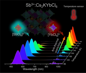 研究采用溶剂热法制备了Sb3+掺杂了的Cs2KYbCl6双钙钛矿晶体,它具有青色的自陷激子(STE)和近红外(NIR)发射,其来自STE和NIR发射的光致发光量子产率(PLQY)分别达到了约26.1%和43.8%。更重要的是,Sb3+不仅有助于电荷或能量吸收和转移,还通过构建一个有效的热增强能量转移通道,使得Cs2KYbCl6产生具有优异抗热猝灭特性的NIR发射。发光强度比(LIR)和时间分辨温度传感器的相对灵敏度(Sr)分别达到21.4和13.6% K−1,其超过了大多数温度感应材料的Sr。这项工作为理解稀土发光材料的光物理机制和设计高性能材料提供了深入的理解。