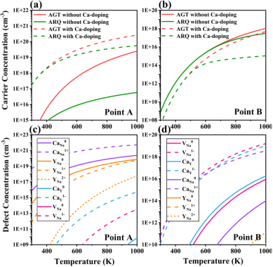 图3:在特定化学环境中,不同生长温度下的载流子浓度(a-b)和缺陷浓度(c-d)。