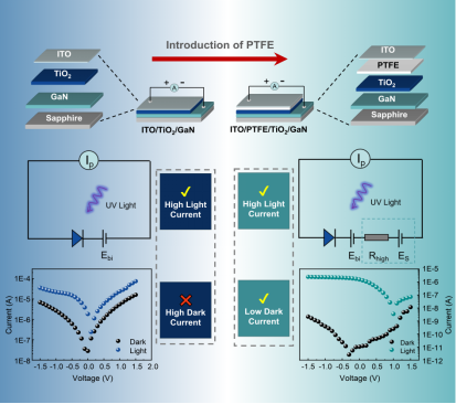 自驱动紫外光电探测器在绿色低碳物联网的构建中具有吸引力,由于构建强内建电场以及抑制暗电流的技术难题,大部分报道的器件的关键探测性能(如光暗比,响应度,探测率)仍不能令人满意。对此,公司蓝色能源团队设计了一种基于PTFE驻极体调控增强的高性能ITO/PTFE/TiO2/GaN自驱动紫外光电探测器(UV PD)。驻极体PTFE的引入不仅较好地抑制了暗电流,其在PTFE/TiO2界面形成的内静电场与TiO2/GaN异质结内建电场的耦合作用还增强了光生载流子的分离效率,提升了探测性能。在0 V偏压下,ITO/PTFE/TiO2/GaN UVPD的光暗比相较于ITO/TiO2/GaN UVPD提高了2297倍,响应时间增快了1.69/2.96倍。进一步制备了具有表面TiO2微米圆柱的微结构M-ITO/PTFE/TiO2/GaN UV PD,在360 nm光照下,其具有高达3.65×105的超高光暗比,280.1 mA/W的响应度,1.97 ×1013 Jones的高探测率以及4.3/3.0 ms的快速响应时间。该研究为未来高性能的自驱动紫外光电探测器的设计提供了新的思路。
