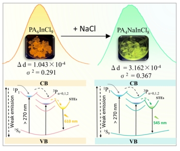 该研究采用典型蒸发结晶法成功制备了PLQY分别高达60%和70%的0D层状金属卤化物Sb3+:PA6InCl9和2D层状金属卤化物Sb3+:PA4NaInCl8。合成的Sb3+:PA4NaInCl8晶体在空气中表现出良好的稳定性,在空气中暴露3个月后,其发光强度仍保持在初始值93%。此外,加入碱金属盐后,0D金属卤化物Sb3+:PA6InCl9可以快速转变成二维层状结构,实现发光开关。我们的研究结果为钙钛矿晶体相的控制提供了新的见解,并加深了我们对钙钛矿的组成、结构和光学性质之间的关系,以及其他掺杂有机-无机金属卤化物的光学性质和发光机理的理解。