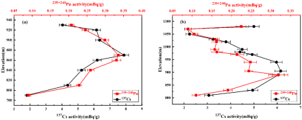 团队为了评估桂林龙脊梯田土壤侵蚀,测量了龙脊梯田土壤中137Cs和239+240Pu的比活度以及240Pu/239Pu原子比,研究了龙脊梯田土壤中239+240Pu和137Cs的空间分布。研究发现该地区土壤中239+240Pu和137Cs均来自全球大气沉降,表层土壤中239+240Pu和137Cs的比活度表现出非常相似的随海拔的升高先升高后降低的分布趋势。土壤柱样中239+240Pu和137Cs的比活度在耕层中趋于均匀分布,在该深度以下呈指数下降。用239+240Pu和137Cs示踪法估算的龙脊梯田土壤侵蚀速率分别为5.44 t/(ha·a)和5.16 t/(ha·a),表明钚可以替代137Cs作为土壤侵蚀研究的理想示踪剂。地形特征是影响龙脊梯田土壤中钚和137Cs分布及土壤侵蚀的主要因素。研究结果提供了中国稻作梯田土壤中钚同位素的比活度数据,首次验证了钚应用于梯田土壤侵蚀研究的可行性,为梯田土壤侵蚀研究提供了技术参考。