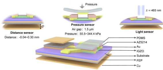 本研究利用摩擦纳米发电机产生的摩擦电势与双栅铟镓锌氧化物晶体管集成,实现多功能传感平台(距离、压力、光以及人工光子突触)。摩擦纳米发电机由机械位移产生的摩擦电势作为栅压调控该晶体管,称为摩擦电子学晶体管。基于双栅的铟镓锌氧化物的摩擦电子学晶体管可作为高灵敏的距离传感器,其灵敏度为1.57×106 mm-1,响应时间为120 ms。压力改变顶栅空气栅介质的电容变化的摩擦电子学晶体管,形成压力传感,其压力传感的感知范围为55.5 Kpa 到344.4 Kpa。由于铟镓锌氧化物的光响应,其光传感的光响应度为105A/W。基于该双栅的摩擦电子学晶体管的持续光电导设计了人工光突触,模拟了Sobel 算子并进行图像边缘检测。这项工作对多感知耦合传感器件和未来神经神经形态器件的多模态可塑性提供一个新的方法。