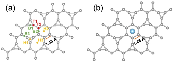 图 1. (a)2×2 的IG超胞;(b)TIG的原子结构。其中钛原子位于H2中空位点的吸附能最低,结构最稳定。灰色和蓝色球体分别表示碳原子和钛原子。黄色、红色和绿色分别表示中空位、顶位和桥位钛原子吸附位点。通过计算结合能发现,钛原子可以吸附在中空位和顶位,结合能分别为T1 (−2.50 eV)、T2 (−2.17 eV)、H1(−2.33 eV)、H2(−2.84 eV)和(H3−2.77 eV)。其种Ti原子在六角碳环的中空位的结合能最低。在六角碳环上方装饰了钛原子后,六角碳环的C-C键从1.43 Å增加到1.46 Å。