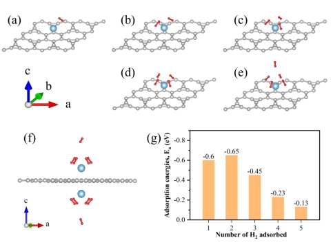 图 2 TIG吸附H2分子后的优化结构和吸附能。(a)~(e) 1~5 H2分子吸附结构。(f) 在IG两侧均放置钛原子,每个钛原子吸附5个H2的结构。灰球、蓝球和红球分别代表碳、钛和氢原子。(g) H2连续吸附能。