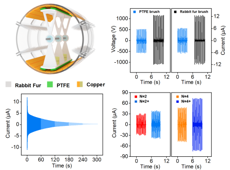 本研究采用了柔性兔毛刷制备了一种栅格化摆动型的摩擦纳米发电机,用于海洋蓝色能源的收集。利用兔毛刷替换之前的介电刷实现了发电机输出电压与电流的倍增,并采用超润滑陶瓷轴承结构进一步降低了摩擦阻力,一次触发后摆动时长超过5分钟。设计并优化了摆动组件的栅格结构,将电流提升至74.0 μA,提升了83%,而由4个单元组成的发电阵列的电流可达120.3 μA。本工作展示了栅格化摆动型发电阵列在远程海洋环境信息监测和金属保护上的重要应用。