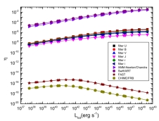 理论研究表明,黑洞-中子星并合能够产生可观测的电磁对应体。近期LIGO-Virgo-KAGRA (LVK)探测到了两个来自黑洞-中子星并合的引力波信号,分别是GW 200105和GW200115。随后,一些地面和空间望远镜对这两个事件进行了后随观测,得到了一些可能的光学和近红外波段的电磁对应体。在这项工作中,我们假设黑洞带电,并尝试通过对比观测得到的电磁对应体和带电黑洞-中子星在旋近阶段驱动的电磁辐射作去限制这两例引力波事件中黑洞的带电量。我们认为该系统在旋近阶段产生的电偶极和磁偶极辐射会驱动一个坡印廷能流主导的喷流,最后通过同步辐射产生可观测的电磁辐射。我们发现喷流中的能量转换成X射线波段辐射的效率远大于紫外、近红外、光学和射电波段(左图)。如果中子星的自转周期