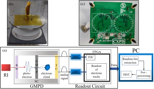 图2:多比特QRNG实验设置。(a)装置结构图。RI,无偏的放射性同位素55Fe;BW,厚度为100 𝛍m的铍窗;SC,气密室;GMCP,气体微通道板;TC,Topmetal芯片。(b)和(c)为GMPD和读出电路的实物图。