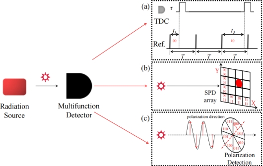 图1:利用X射线辐射的多比特QRNG原理图。(a)光子到达时间测量的随机数提取方法。(b)光子空间位置测量的随机数提取方法。(c)光子偏振测量的随机数提取方法。