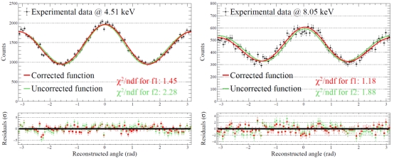 图2 对30°斜入射实验数据的拟合结果。左图:入射光子能量4.51 keV;右图:8.05 keV。入射光的偏振方向在入射平面内。