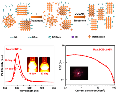 钙钛矿纳米片因其优异的光致发光性能和厚度依赖的带隙发光特性,一直是光电材料领域的研究热点。然而,尤其是基于碘化物的钙钛矿纳米片,通常表现出较差的稳定性,这成为其应用推广的瓶颈。针对这一问题,纳米光子学团队成员通过采用氢碘酸对短链强配位配体十二胺(DDDAm)进行原位刻蚀辅助表面修饰,实现了关键性能的飞跃。研究发现,氢碘酸能够有效刻蚀CsPbI3纳米片表面未完全形成的八面体[PbI6]4−,同时利用过量的碘离子(I−)和引入的DDDAm配体对表面缺陷进行钝化。这种协同作用显著提高了材料的辐射复合速率,使修饰后的CsPbI3纳米片在大气环境下暴露87天后仍能保持优异的光致发光特性,而未经处理的样品在21天后即退化为无光致发光的δ-CsPbI3。作为概念验证,研究团队利用这种处理后的CsPbI3纳米片制备了钙钛矿发光二极管(PeLEDs),其发光波长为600 nm,半高宽仅为22 nm,外量子效率(EQE)达到2.98%,展示了优异的电致发光性能。该研究提出了一种基于氢碘酸(HI)辅助刻蚀的表面修饰策略,为钙钛矿纳米片的合成及其在光电器件中的应用开辟了新路径,有望推动钙钛矿纳米片在光电技术领域的集成应用。