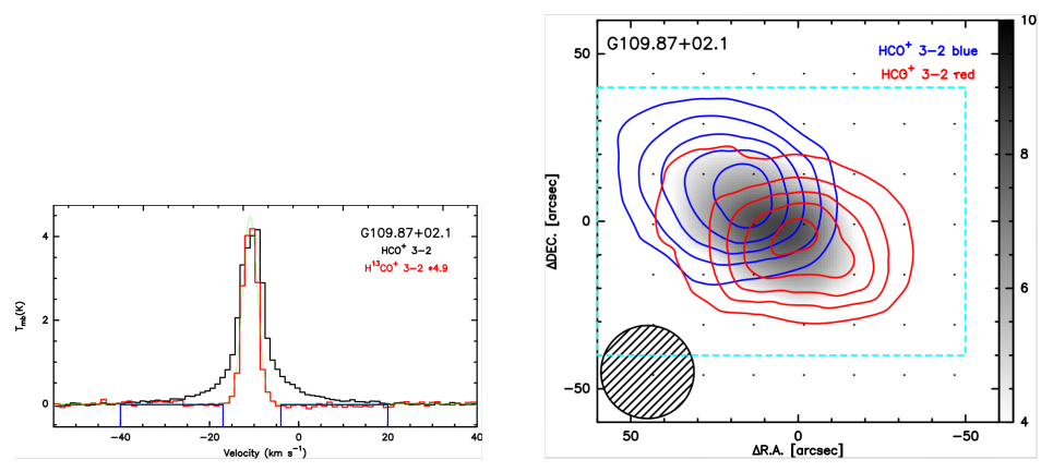 1 左图为G10907+02.1的平均谱线图,右图为G10907+02.1的线翼积分流量空间分布图。