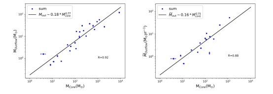 2 左图为HCN 3-2示踪的致密外流分子气体质量与H13CN 3-2示踪的分子云核质量的关系图,右图HCN 3-2示踪的致密外流分子气体质量流失率与H13CN 3-2示踪的分子云核质量的关系图。