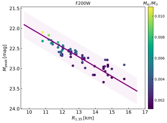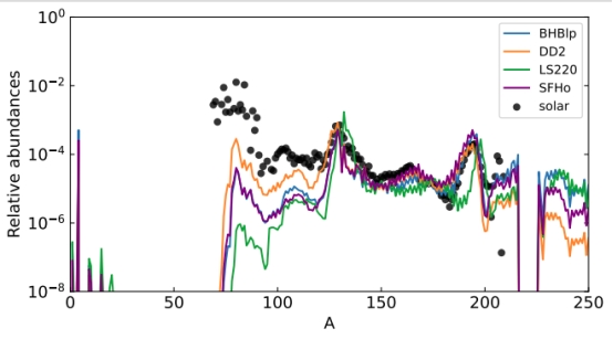 在这项工作中,我们使用来自不同状态方程的天体物理条件作为核合成输入,以探索各种状态方程对快中子捕获过程核合成和千新星发射的影响。我们的结果表明,合并喷射物的元素丰度(图1)和千新星光曲线(图 2)都强烈依赖于中子星状态方程。给定两颗中子星的质量,较软状态方程的合并往往会产生更多的喷射物质,千新星光变曲线越亮,峰值光度越高(图 3)。中子星状态方程与峰值光度之间的关系为在中子星合并的多信使观测中约束状态方程的性质提供了一个探针。