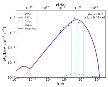 Wang et al. (2024) 的研究中,我们构建了参数化的 GRB 结构化喷流模型,并探讨了混合喷流茧(MJC)区域中剪切加速电子的辐射。研究表明,在正轴观测下,剪切加速电子与喷流核心激波加速电子的同步辐射(Syn)和同步自康普顿辐射(SSC)相互叠加,可成功解释某些GRB瞬时辐射的能谱特征。