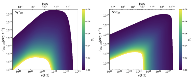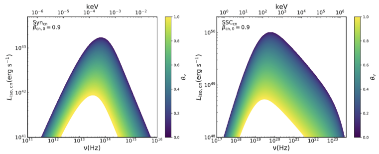 2:激波加速电子同步辐射(左)和同步自康普顿辐射(右)随视角的变化