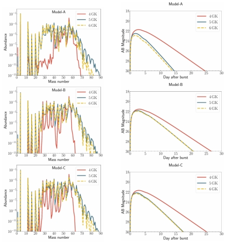 为了验证这一假设,该研究基于SkyNet核合成网络,系统模拟了NS-WD并合过程中抛射物在不同温度条件下的核素演化,并构建了相应的类千新星光变曲线模型。模拟结果显示,尽管在多种模型下均有轻中子丰富元素形成,但最终产物的质量数均小于90,意味着NS-WD并合并非r过程中重元素合成的理想环境。进一步与GRB 211211A中观测到的千新星候选信号进行对比分析后发现:若NS-WD并合后产生了超大质量磁星或稳定磁星,则该并合事件仍可能是GRB 211211A及其伴随千新星辐射的来源;反之,如果不考虑生成磁星的情形,仅通过WD与NS的并合机制则难以解释GRB 211211A所观测到的早期光学及近红外辐射。