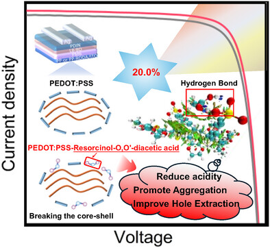 工作一:“Overcoming the Conductivity-Stability Trade-Off in PEDOT:PSS via Hydrogen-Bond Modulation Enables 20.0% Efficient Bilayer Organic Solar Cells”发表在期刊《Advanced Functional Materials》上。
