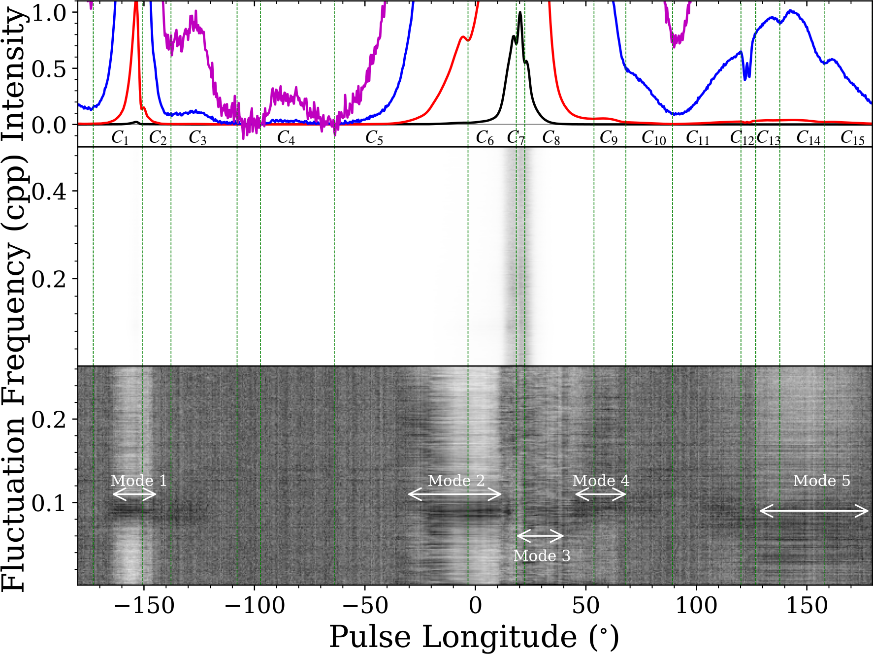 通过分析积分脉冲轮廓,研究人员发现,该脉冲星至少呈现15个辐射成分,其成分个数为所有脉冲星中最多的一颗,这对不同的脉冲星射电辐射锥模型提供更加严格地限制。通过分析高信噪比的单脉冲数据,研究人员还发现额外3种新的调制过程,如图2所示,其中Modes 2,4和5首次被认证。