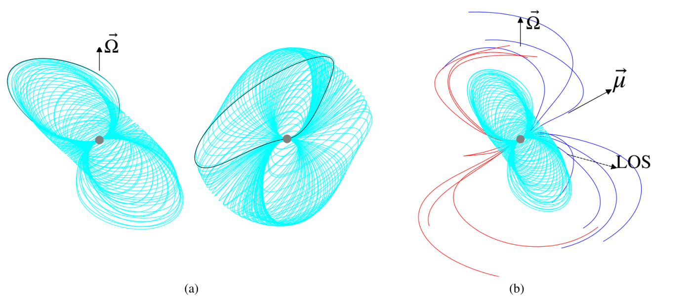图3、脉冲星B1929+10三维磁层结构。(a)最后闭合磁力线在三维空间中的行为,其中黑色磁力线为一族特殊磁力线的一个代表,它们在低海拔处聚集成一团。(b)三维磁层辐射几何。