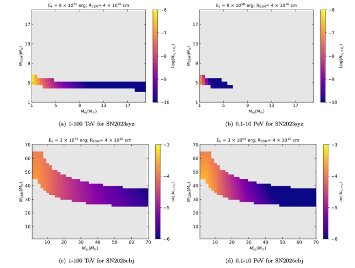 考虑到这样的一个较低的偶然概率,我们基于抛射物和星周介质相互作用的模型,分别计算了这两个SN IIn可能产生的高能中微子辐射。基于这两个事例的热光变,我们采用黑体辐射公式计算出一个可能的黑体温度,并基于此给出一个可能的中心引擎的动能范围。由于SN IIn的其他参数(如抛射物质量,星周介质质量等)也具有很高的不确定性,所以我们探究了一个宽的参数范围来计算这两个SN IIn可能的中微子辐射。在考虑最乐观的动能以及星周介质半径的情况下,通过扫描不同的抛射物质量和星周介质质量,我们分别得到了模型预期的中微子数,如图2所示。